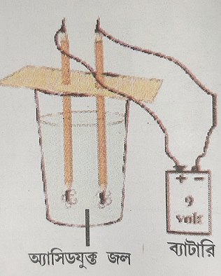 উঃ- জলে একটু সালফিউরিক অ্যাসিড (H2SO4) মিশিয়ে তার মধ্যে ব্যাটারির সাহায্যে তড়িৎ পাঠালে দেখা যাবে দুটো তড়িতদ্বারেই বুদবুদ আকারে গ্যাস নির্গত হচ্ছে। এর মধ্যে একটা হলো হাইড্রোজেন ও অন্যটা হলো অক্সিজেন। এক্ষেত্রে জল বিয়োজিত হয়ে হাইড্রোজেন ও অক্সিজেন গ্যাস উৎপন্ন করে।