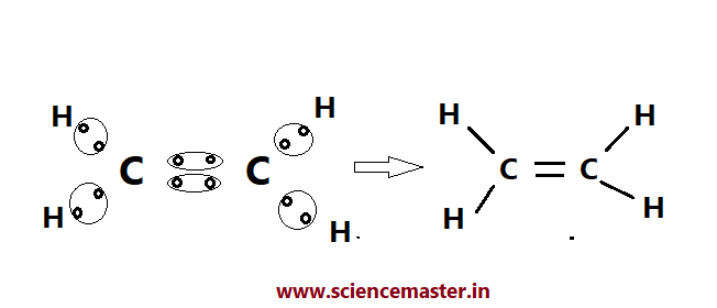 উঃ- সমযোজী দ্বি বন্ধনযুক্ত একটি যৌগিক অনুর উদাহরণ হল ইথিলিন যার লুইস ডট গঠন নিচে দেওয়া হল।